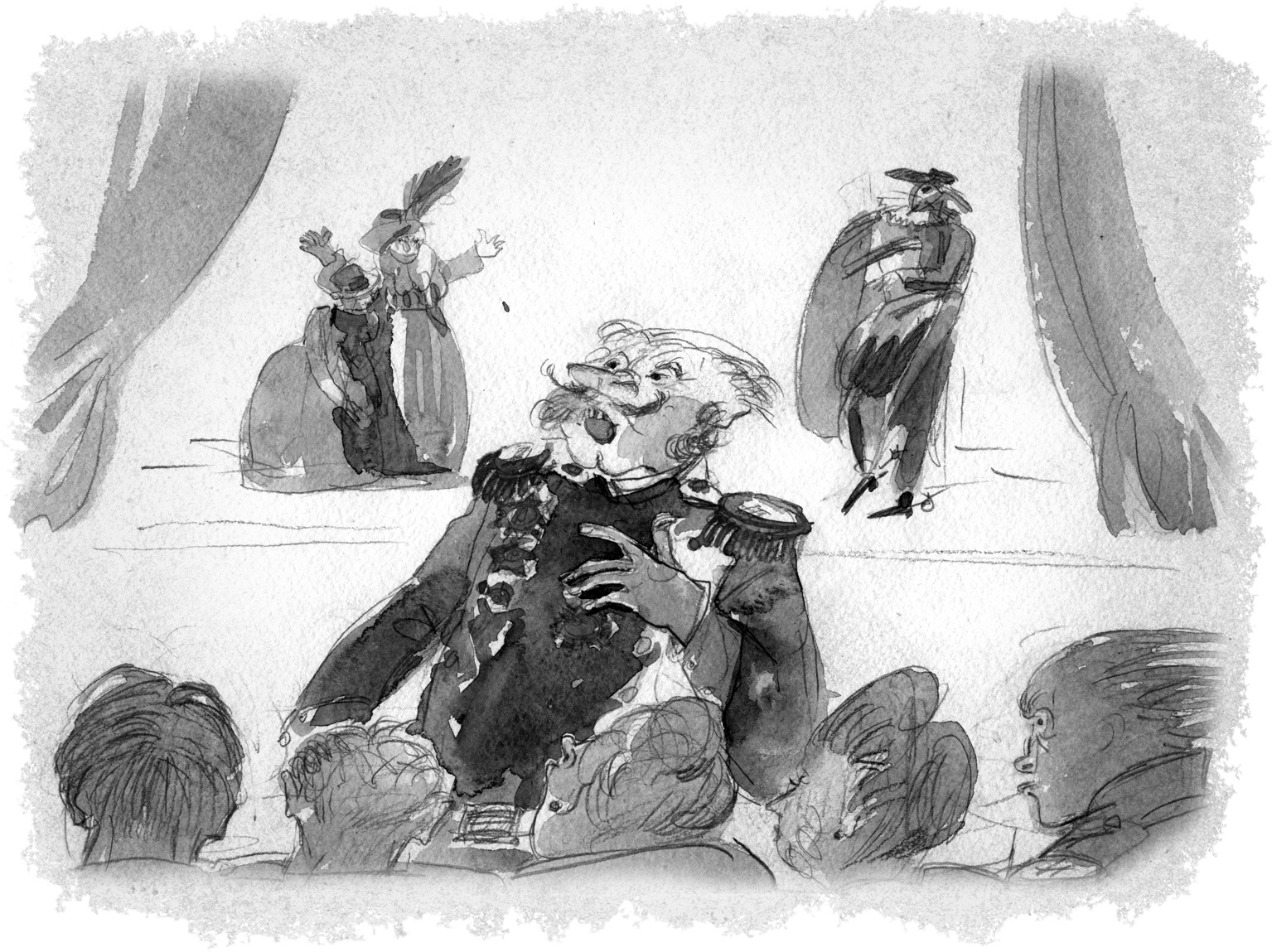 Согласно билету Бибиков разместился в литерном ряду, отчего вначале немного напрягся, так как люди, сидящие рядом, были сплошь в генеральских мундирах и сияющих орденах. Под стать им были и их жены. Все в бриллиантах и французской парфюмерии. Не успел Александр Петрович освоиться, как заиграл оркестр и началось действо. Поначалу оно забавляло и даже несколько увлекало его. Но к середине спектакля вторая волна алкогольного опьянения накрыла Бибикова. Вдобавок сидящая рядом толстая генеральша начала потеть и излучать жар, как голландская печь. Эта смесь потного тепла и обострившегося запаха духов окончательно ввели его в состояние транса. Перед ним замелькали лица поющих актеров, сановных особ, лысого полуспящего генерала с двойным подбородком, нафуфыренных дебелых дам… Лиц было много, и все они были разные – старые и не очень, блондины, брюнеты и даже рыжие. Но сквозь туман Бибиков вдруг ясно и отчетливо увидел, что есть в этих лицах одно еле уловимое общее. Всем им, сидящим в литерных рядах, абсолютно было все равно, как поют и играют актеры. Они пришли сюда не за этим. Им важно было быть в первых рядах. И пока они здесь, у них будет все: продвижение по службе, деньги, награды и другие прелести жизни. Перемещение в середину, а уж тем более на галерку равносильно смертельному исходу.