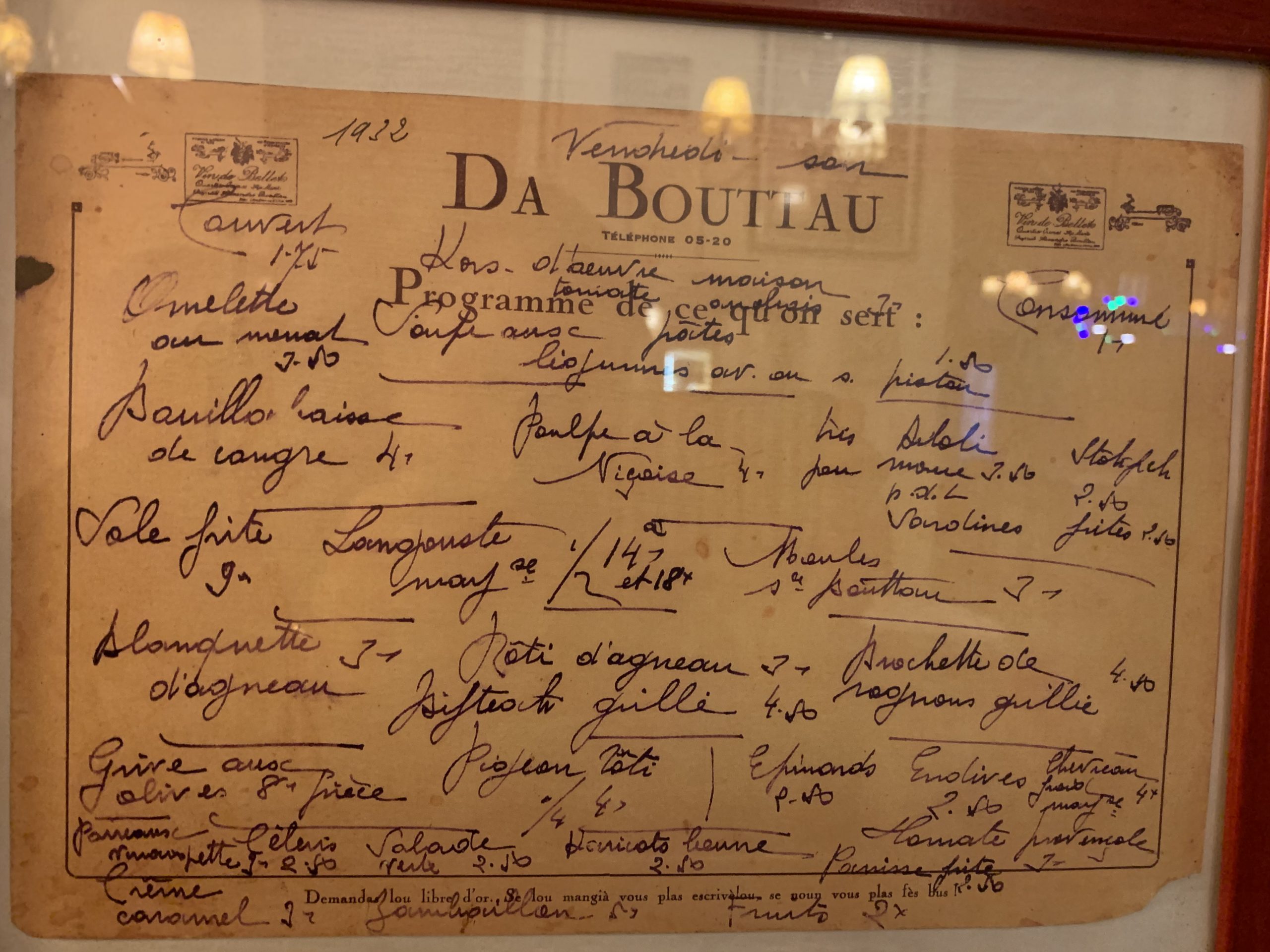 За дверью ждала удача: на стене под стеклом висело меню ресторана «Бутто» – рукописное, на пожелтевшей бумаге. Значит, это именно тот ресторан, в котором бывал И. А. Бунин. Интерьер, в том числе черные от времени деревянные балки потолка, соответствовал описанию в «Грасском дневнике».